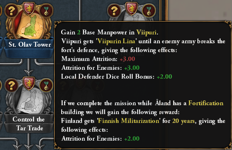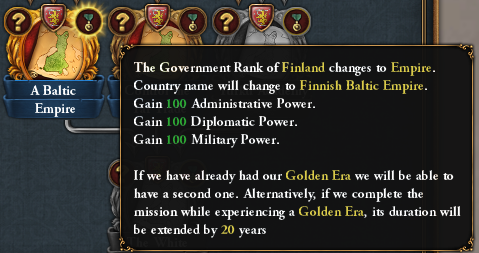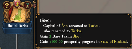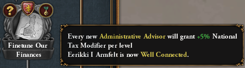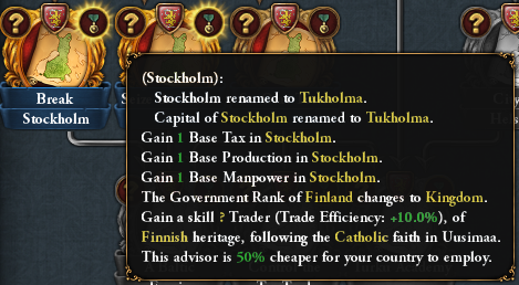 Completing the aforementioned mission will open the way for 3 new missions. First off, conquering Stockholm from your former overlords will change the name of Stockholm (if your culture is Finnish), grant it some development and give you access to a discounted advisor: