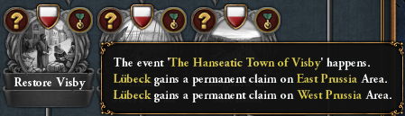 Each of these will grant our ruler between 1 and 3 monarch stats (or monarch points if already at 6), along with this powerful ruler-tied modifier as well as permanent claims on the Baltic Trade Node (that’s a surprise tool that we will use later):