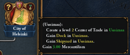Founding Helsinki will grant a level 2 Center of Trade as well as a few buildings for your newly developed province. Note that if you complete the mission with a Shipyard and a Dockyard, you will instead gain their upgraded versions: