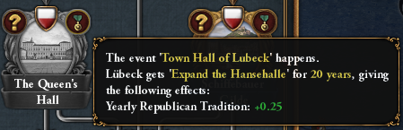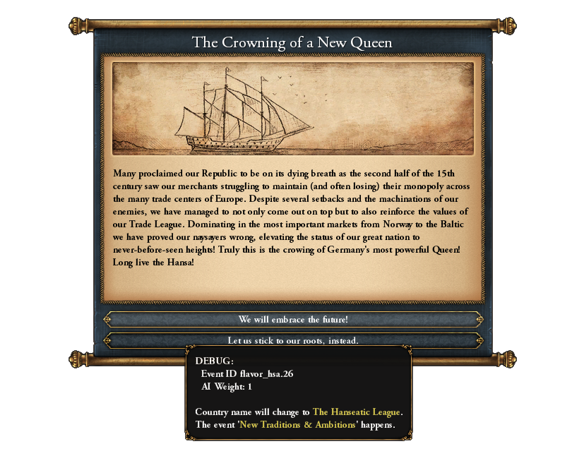 The event Crowning of a New Queen grants 2 different bonuses. Either you change your country’s name to The Hanseatic League and gain a new idea set or keep your current ideas while your ruler gains +1 adm/dip/mil and you gain 3 Mercantilism:
