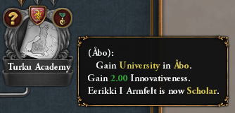 The Turku Academy, your domain’s first university and institution of higher education, will yield the Scholar trait for your ruler, Innovativeness and more: