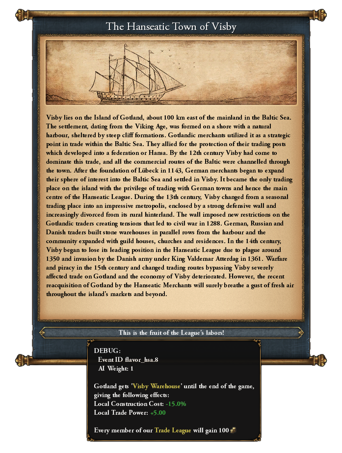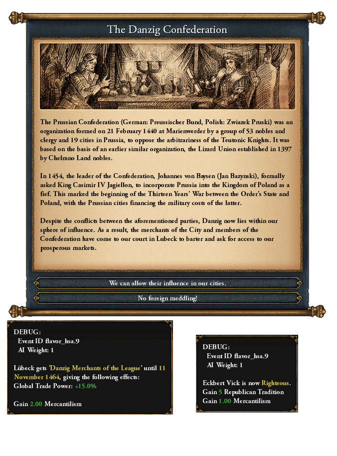 Earlier in this Developer Diary, I mentioned that the Emperor DLC Lübeck tree will be playable for Hamburg and Bremen, since Lübeck got a shiny new tree. To add to that, the Hanseatic League, which is the reward for the final flavor mission for Lübeck, is now available as a formable nation and will come outfitted with the Lübeck tree and the evolved idea set I showcased just above.