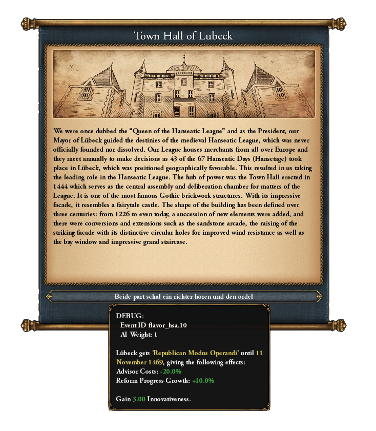 In the interest of time, this Developer Diary cannot be too large. Thus, we have intentionally omitted showcasing the rest of the flavor coming for Lübeck. This Diary barely covers 40% of the new content! As mentioned above, this Lübeck mission tree will be part of the **base game** and will come fitted with 36 new missions and 20 new events!