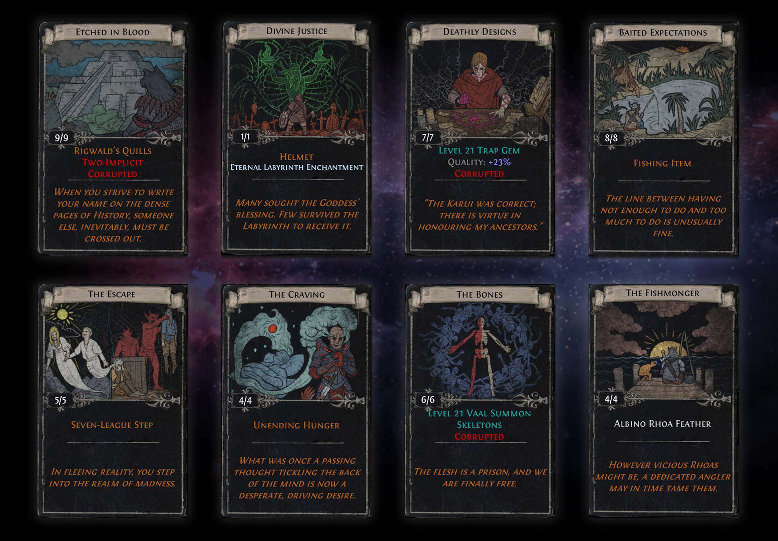 As you know, we're adding 14 new Divination Cards created by our supporters in our upcoming Conquerors of the Atlas expansion. In addition to four divination cards which were already revealed in our teasers and on the announcement page, today we're showcasing eight more.