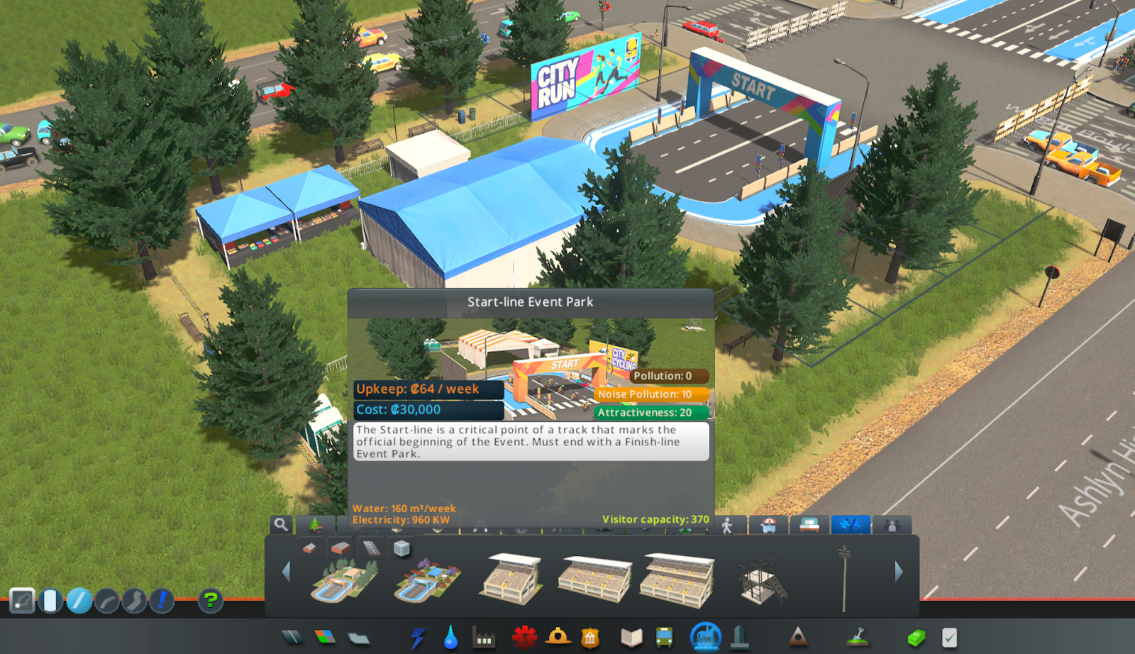 To establish a route for your events to be held on, first, we should identify a start and finish point within the city. The Start-line Park will be the main building and starting point for parades, running races, and cycling races. Once you are satisfied with the start, a Finish-line Park can then be built where the event route will end.