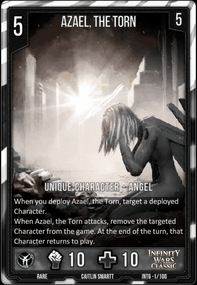 Seeker of the Unpurged Cost:2 Morale:4 (FD+OoS) Character - Human Flame Strike 2 When CARDNAME dies, draw a Unique Character. 2/8 Raider's Opputunity Cost:2 (FDx1) Ability Target Character gains +4/+0 and Plunder 1. Azael, The Torn Cost:5 Morale:5 (OoSx1) Unique Character - Angel When you deploy Azael, the Torn, target a deployed Character. When Azael, the Torn attacks, remove the targeted Character from the game. At the end of the turn, that Character returns to play. 10/10