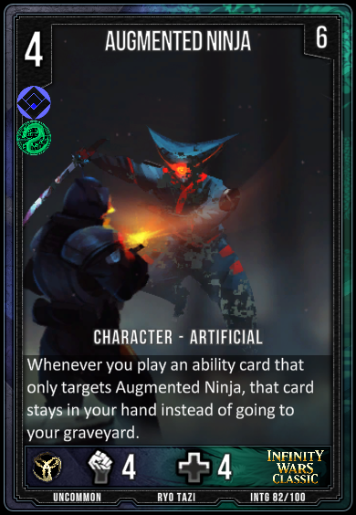 Drason, Armory Keeper Cost:7 Morale:8 (GENx1) Unique Character - Human When Drason enters the Deployed Area, create an Upgrade in your hand. Whenever you play an ability card, if Drason is in the Assault Zone, deal 2 damage to all enemy Characters on the battlefield. 20/14