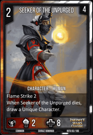 With Flame Dawn Footman and Knight of the Flame Dawn, we felt there was a sufficient saturation of "Vanilla" Characters in the faction for the current size of the card pool. So this card has been redesigned to allow for low but constant pressure if the opponent stabilizes, creating an often exciting tension about how to wieght up kill speed versus defense.