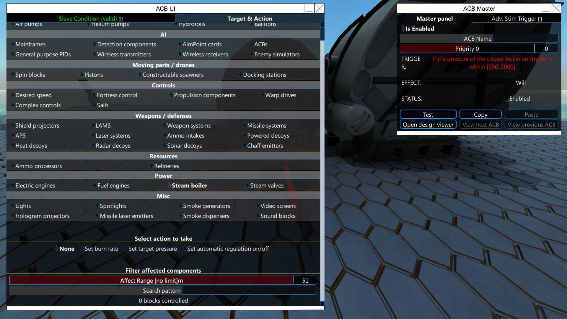 Some minor changes to a few block types such as; Munition warners can see through railings Sheild projector UI has been updated APS and Crams now have the option to aim straight at the enemy, ignoring gravity and movement, which can be found in the dropdown list when using Q on the turret and changing from Only low to Direct line. Crams also have a tiny bit of guidance and built-in gravity compensator when using aim setting “Only High” this will give them a slightly better chance of hitting an enemy.