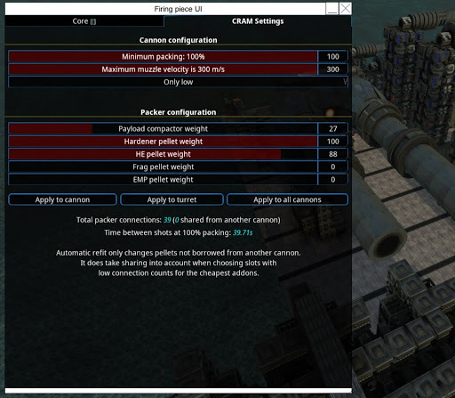 The screenshot above is the UI where you can set the sliders to the pellet ratios you want to use, and it switches out pellets/compactors to be close to that. So you have a CRAM with 100 total connections and set up 20 compactor (previously known as ammo box) /100 hardener/100 HE Total of your weights is 220.