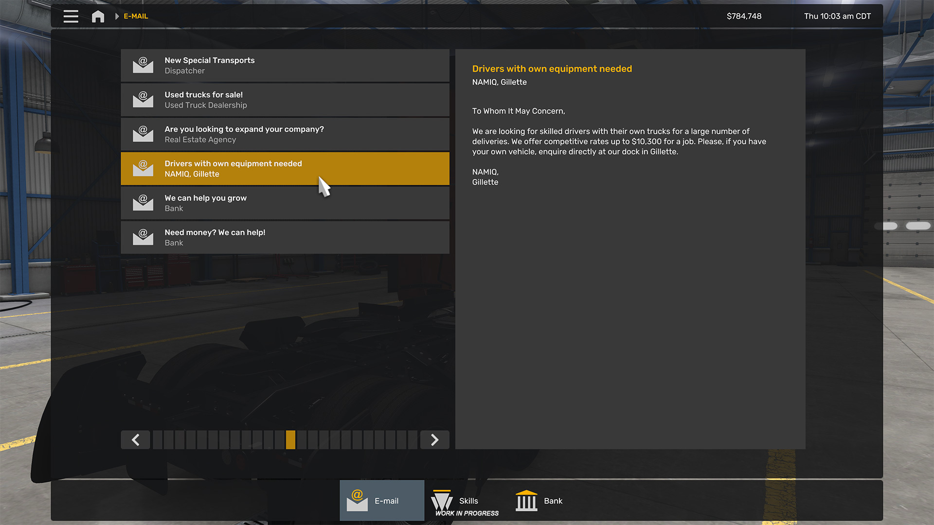 When it comes to job opportunities for truckers, Des Moines offers two main logistics hubs for pickups and deliveries. In the northern area, you'll find a construction and a shopping mall depot, along with a key local tire factory that features a unique office building suspended above the road. The southern logistics zone is home to a chemical plant in need of regular supplies. In addition, there's a grain elevator and train service depot in the city that both require your hauling expertise.