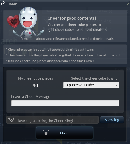 1) How to Cheer the Map CreatorsFind the Cheer button to the top left of the screen when looking at the Map Info in Studio Mode. You can also use the Cheer feature in-game if the creator has a Cheer Message Board placed in the map.2) Gifting Cheer Cubes You can send the creator a message, or convert the Cube Fragments in your possession to Cubes to gift to the creator from the Cheer window. Cube Fragments can be earned by purchasing cash items.3) Using Cubes The creator can use the Cubes they get to exchange them for Mileage.