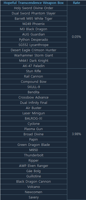Hopeful Transcendence Weapon Box Promotion (10/30 - 11/27) You can purchase Hopeful Transcendence Weapon Boxes from the shop during the event. The boxes may contain one of 12 Transcendence weapons, identical to those inside the Lucky Transcendence Weapon Box.