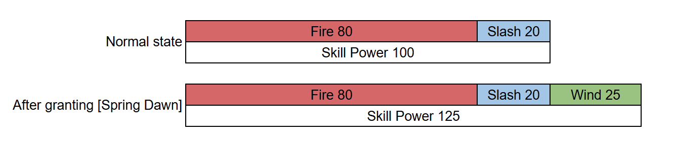 Skill Spring Dawn adds Wind attribute at 25% of skill power, Skill Summer Night adds Thunder attribute at 25% of skill power, Skill Autumn Dusk adds Water attribute at 25% of skill power, Skill Winter Daybreak adds Holy attribute at 25% of skill power. Additionally, each one multiplies damage by 1.25.