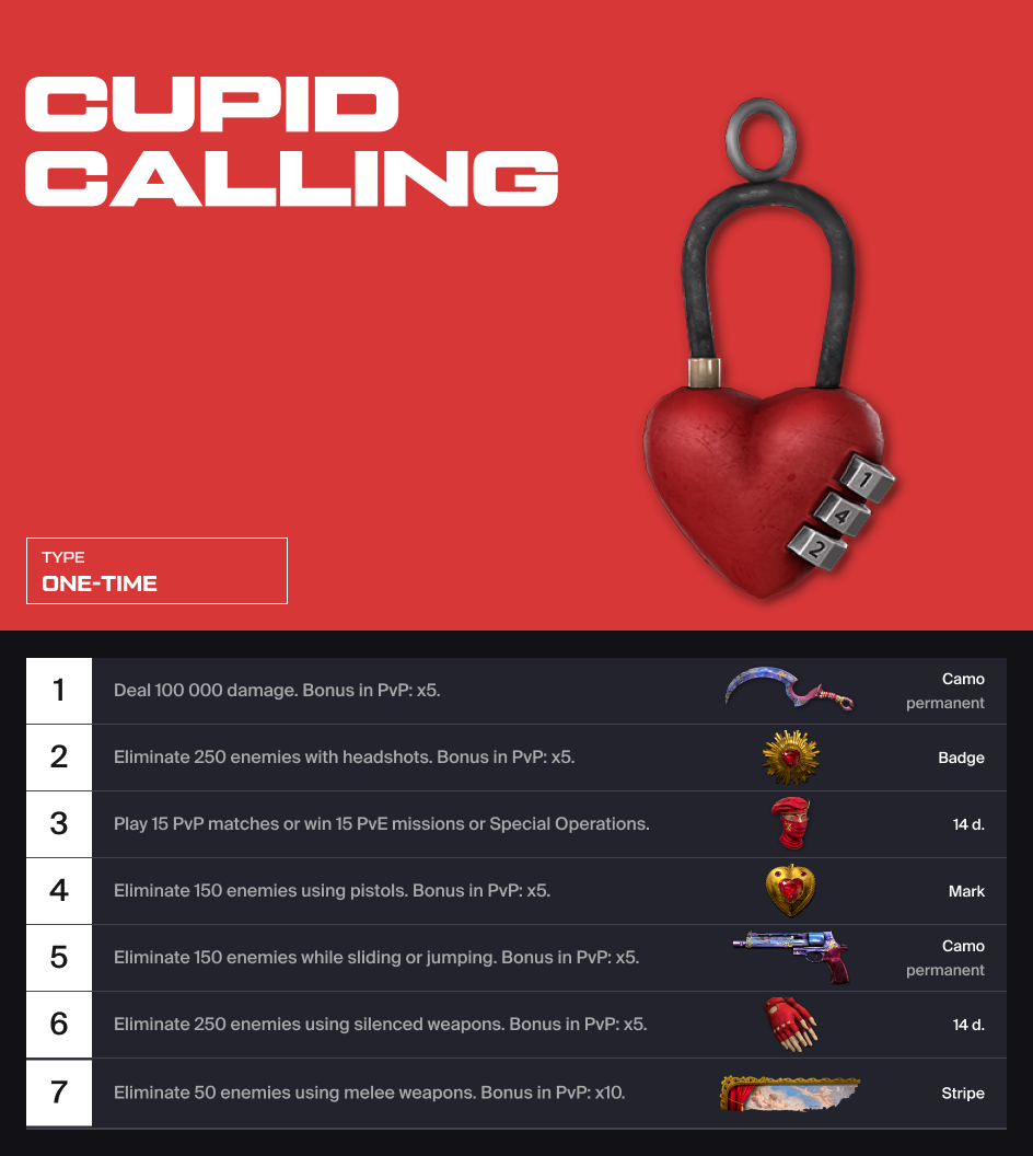 From February 10th until February 24th there will be a special contract available. Complete tasks and get camos, equipment, achievements and a lovely charm!