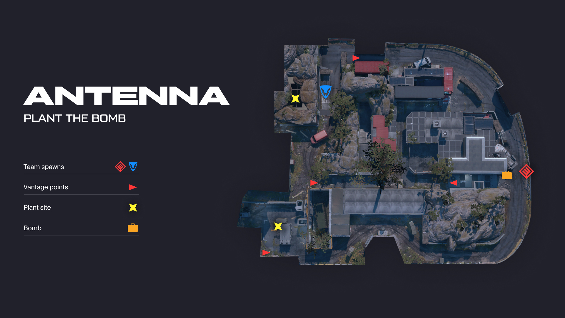 We've prepared a top-down view of the map, so you can familiarise yourselves with the bases, key spots, and bomb planting sites. Take a closer look at the key positions, capturing them can make defending your objects significantly easier. Be careful, though, as the enemy probably knows about them as well. The central corridor is excellent for a fast regrouping to a different bomb planting site to sabotage the enemy.