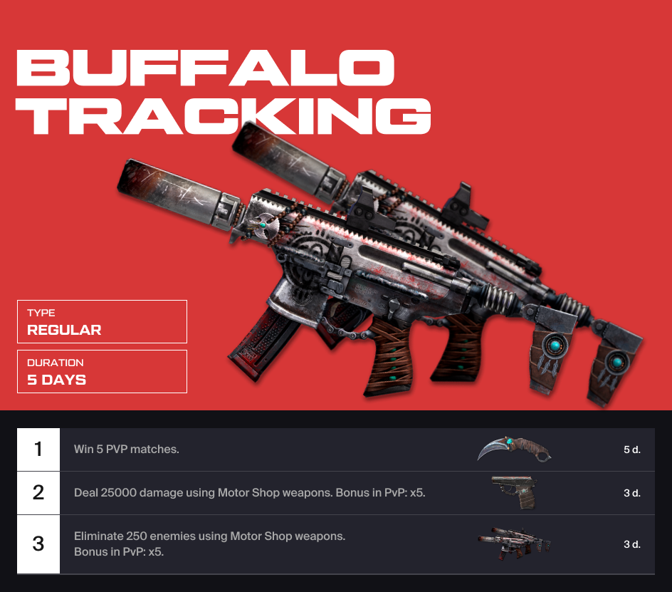 We've added contracts with the agent content. Complete tasks to get "Motor Shop" weapons, boxes with the Buffalo Agent skin, unique achievements, a weapon charm, and other useful items.