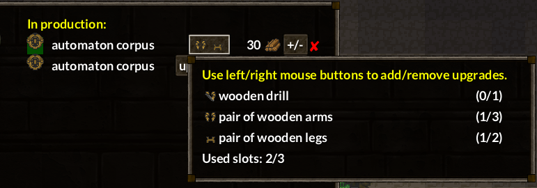 The Necromancer update featured a new, sleek UI for adding upgrades to crafted undead, and I realized that it mostly duplicates the automaton assembling system. Since the latter is rather complicated and cumbersome, I decided to remove it, and adapt the new crafting upgrades UI instead. The added bonus is that you can now easily schedule production of identical automatons en masse, which wasn’t possible before. As far as I can tell, all functionality has been replicated, except automaton paints, which I can add back in the future if there is popular demand (I’ve never used them personally).