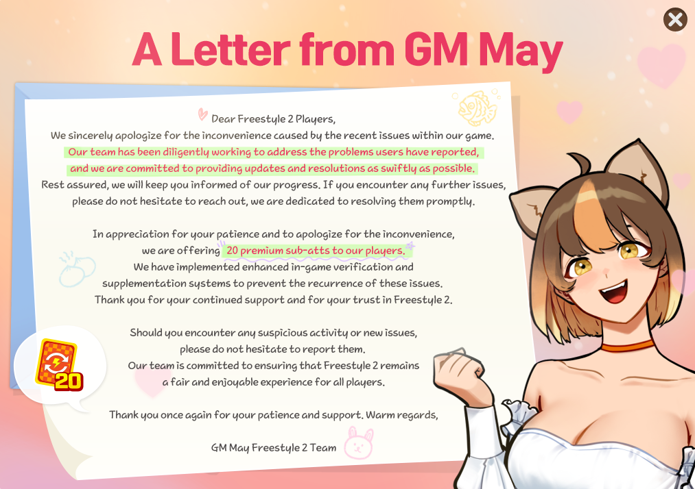 As a token of our gratitude for your continued support and patience, we're excited to offer each of our players 20 Premium Sub-atts! It's a small gesture of our commitment to your gaming experience.
