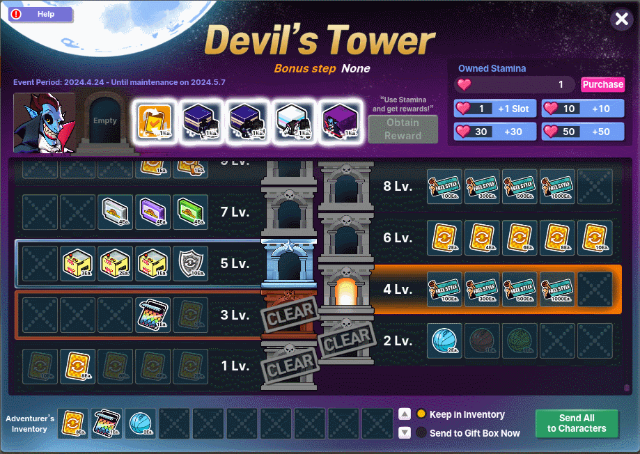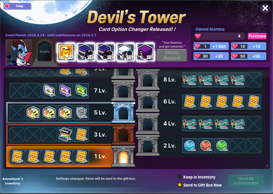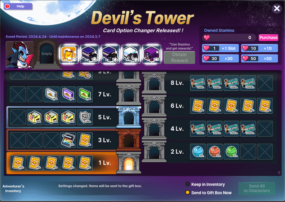 [1] Devil's Tower rewards are sent to the inventory by default. [2] You can select a character and send all items collected in the inventory. [3] If you want to send different rewards by character, you need to change settings so that the items will be 'directly sent to the gift box' before starting the event. [4] Please note that the settings will take effect after they are applied.