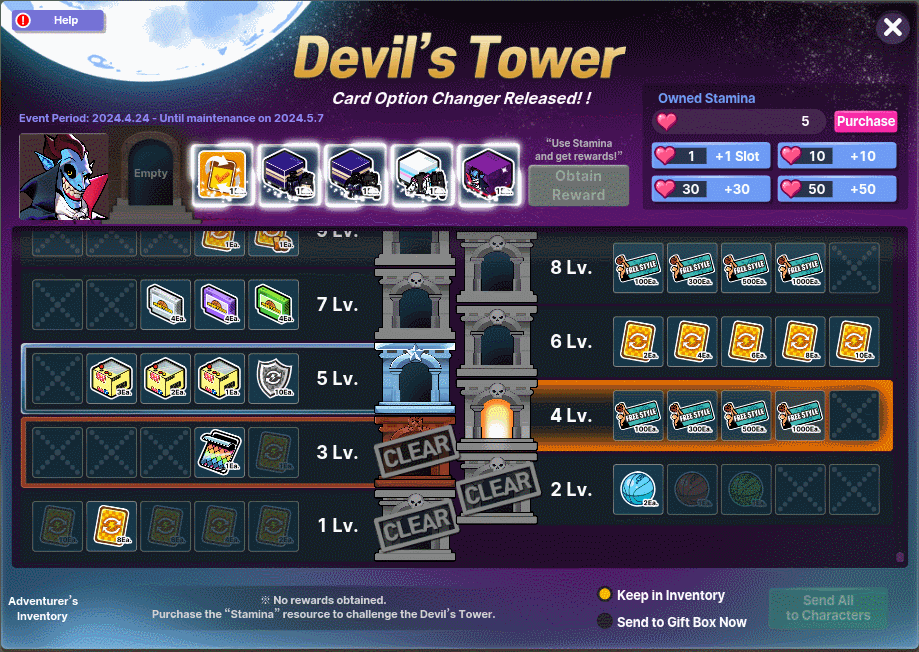 → Up to 5 rewards are placed on each level, and you can randomly obtain one of them. → After you receive the reward on the final level, you will go back to the first level and play again. → After you have claimed all 5 rewards on the final level, “level 0” will be unlocked where you can randomly obtain one of the rewards placed there. → The Card Option Changer item obtainable through the Devil’s Tower event allows you to change the sub attributes of the Allstar Cards (offense/defense).