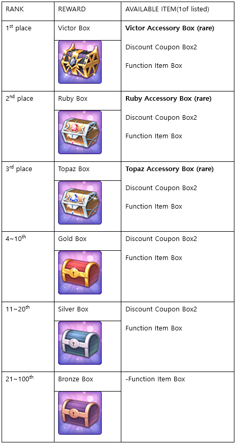 [TOURNAMENT WINNER REWARD] - Regardless of league result, you can get rewards based on your daily Tournament result. - When you enter waiting room, You will dance as a winner of tournament. (Last 1 day) - At waiting room, A trophy is shown besides your character’s name. (Last 1 day) - At your information window, you can see each tournament record. (permanent)