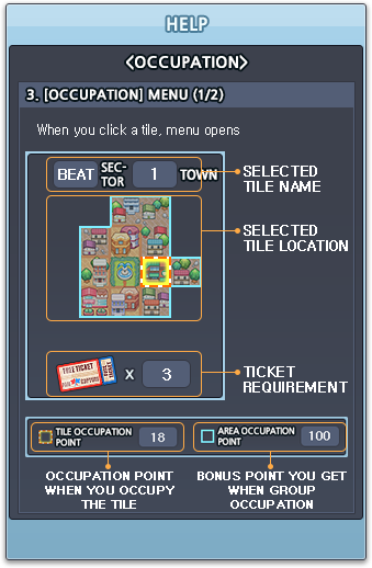 OCCUPATION POINT - When you are successful, you receive ‘Occupation Point’. - If you lost a tile to another Fam, you will lost received ‘Occupation Point’ - There is two kind of Occupation Point. -. Tile Occupation Point : Point for each Tile. -. Area Occupation Bonus : When you occupy a group of tile, you will receive ‘Area Occupation Bunus’. There is 14 group.