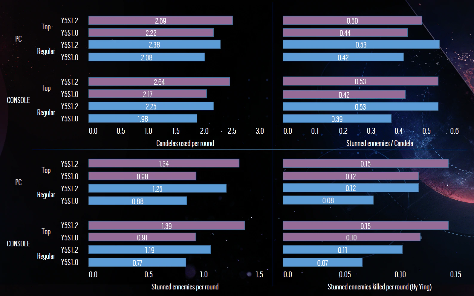 Ying was buffed several times during the last few months. During Y4S4.3 we added an extra pellet to her Candela, and changed their dispersion to increase the gadget reliability. According to our data, this change had little to no effect on Ying performance and popularity.