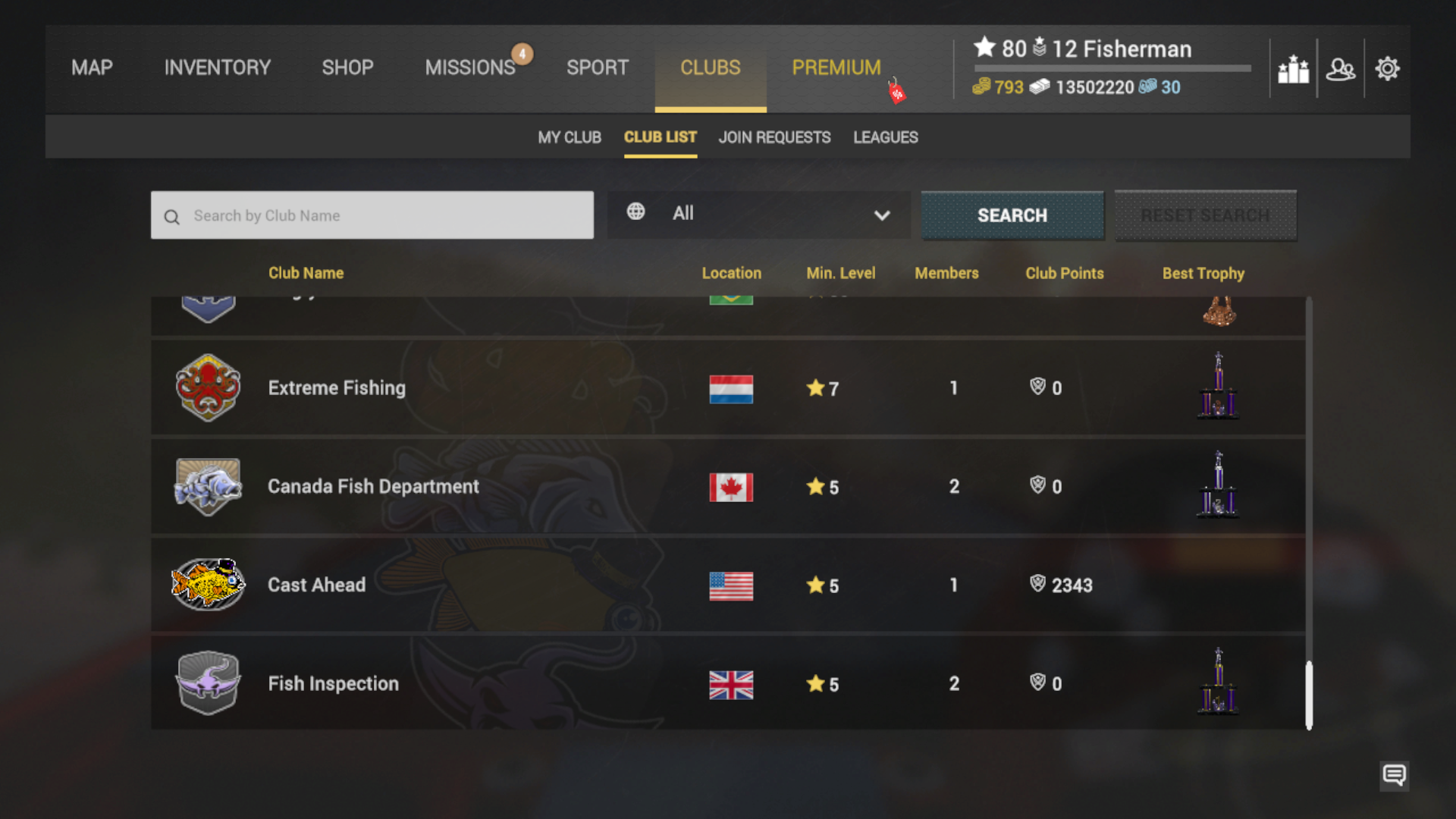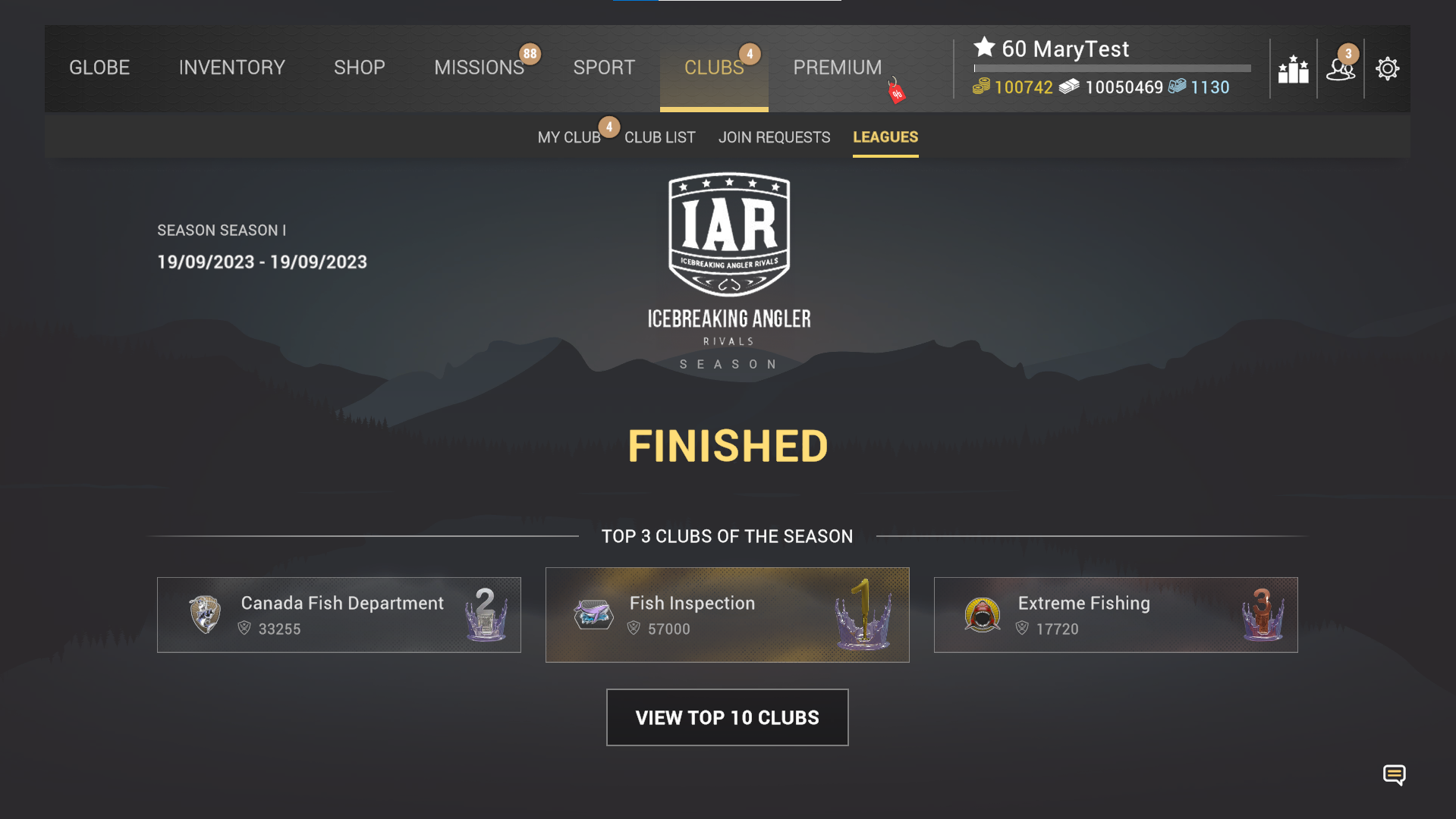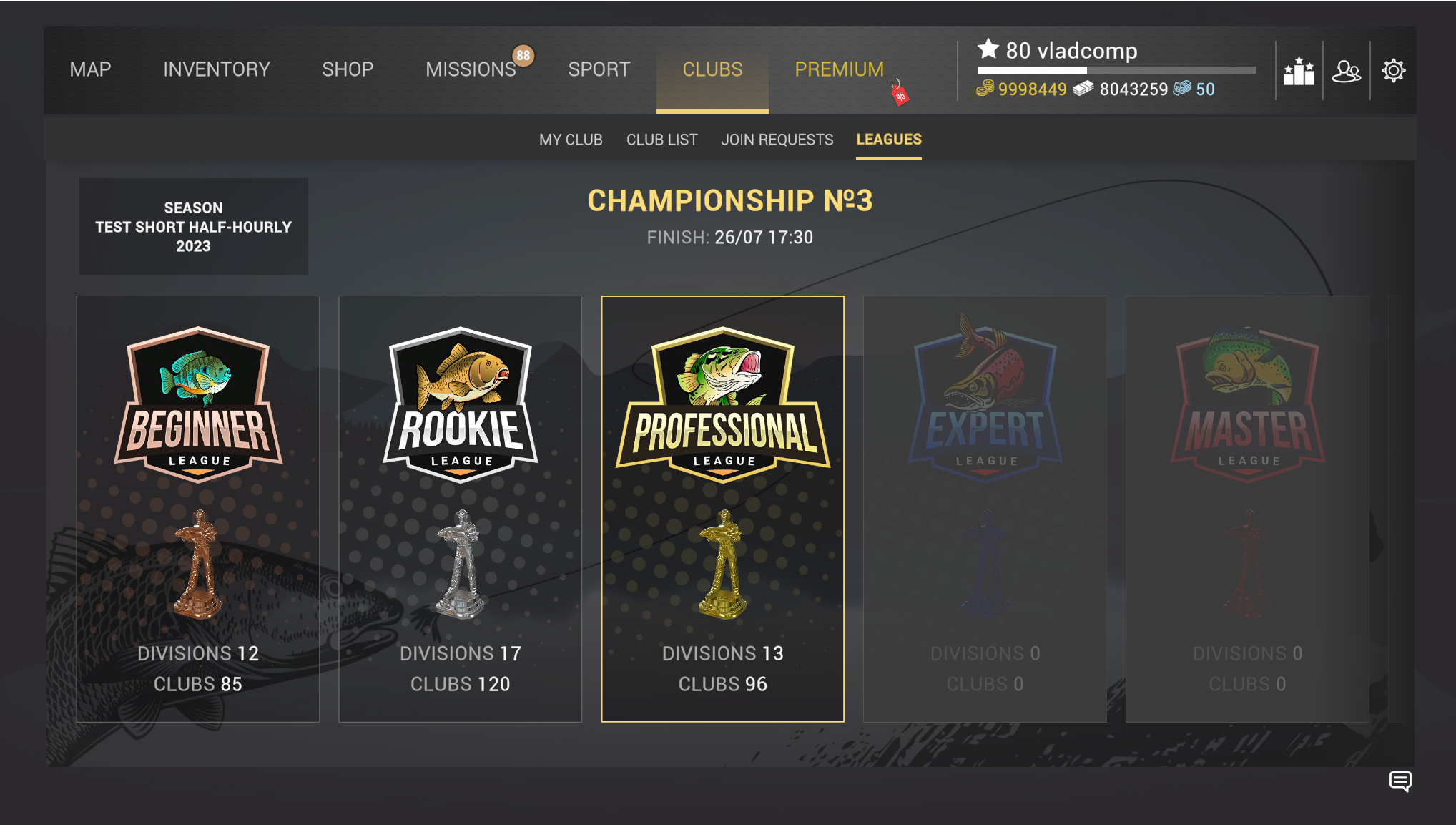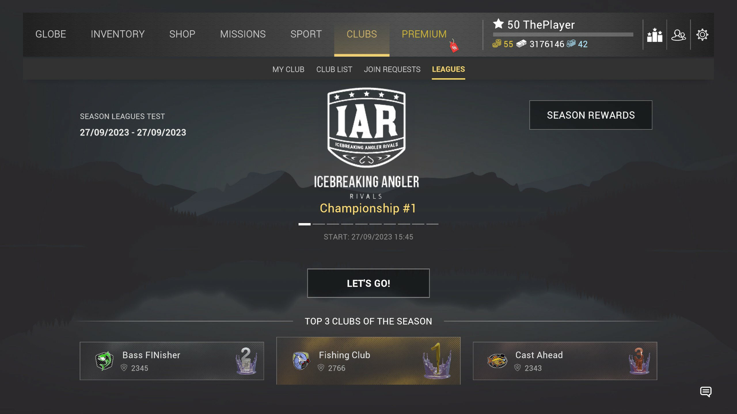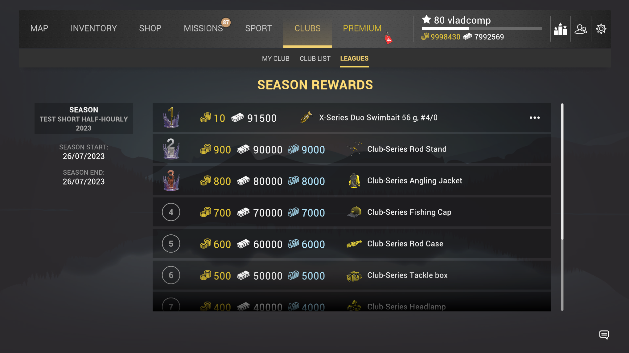 When the club is in a certain League the members of the club receive bonuses in experience and credits for fish caught. Every fish caught while the club is in the League counts. Players who are members of the Season Winners Club receive rewards for winning the Season and League. These are the top 10 clubs that scored the most Club Points during the Season.