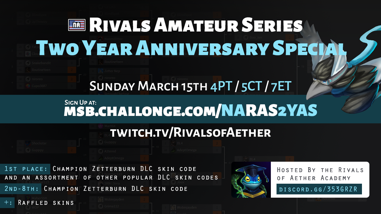 The Rivals Amateur Series is one of the longest community-ran online tournaments in the scene. Help celebrate their 2 year anniversary this Sunday with a special event featuring prizes and a live stream.