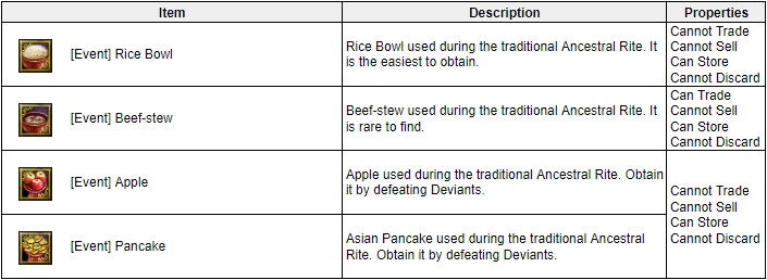 Track down only the finest ingredients to honor the ancestors and receive their blessings. Rice Bowl and Beef Stew can be obtained by defeating deviants level 150+ throughout the land. Apple can be obtained by defeating dungeon deviants over level 150, and Asian Pancake can be obtained by defeating field deviants over level 150. Collect as many of these resources as you can and exchange them for some great items from Festival Trainee, Baekhwa.
