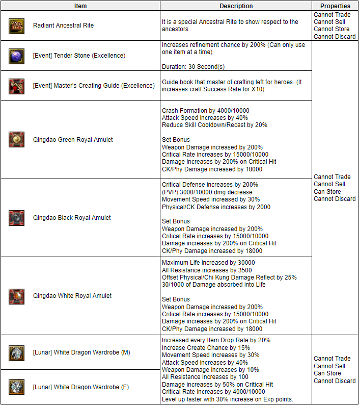In exchange for 30 [event] Aura of the Ancestors, you can obtain a Radiant Ancestral Rite in which you can use to obtain all of the following items.