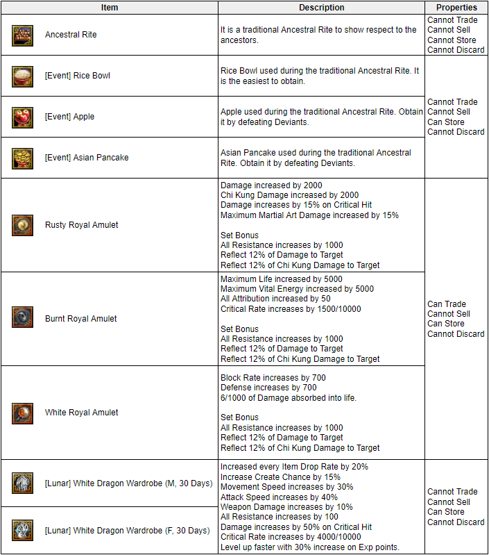 Upon bringing offering resources to Seo Hwarang, you can obtain Ancestral Rite. Bow to the ancestors by double-clicking to receive their blessings and good fortune. When activating the Ancestral Rite you will receive 1 Aura of the Ancestors and 1 Lunar Growth Support Bag, including a chance to obtain other great items!