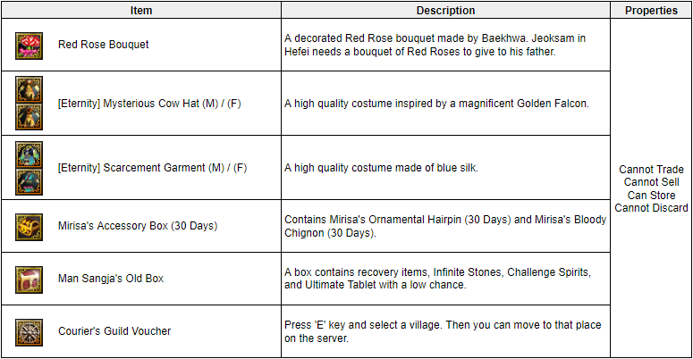 Properties: Cannot Trade, Cannot Sell, Can Store, Cannot Discard (Once open, all items are Tradable)