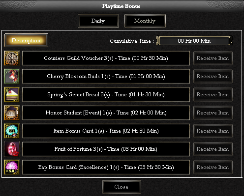 Each day you log in, make sure to click your “Stamp Tracker” icon located below the mini-map in the game to receive your reward(s). During the event duration you can receive one Cherry Blossom Buds by logging in for one hour through Daily Playtime Bonus, and an [Event] Cherry Blossom Buds Box by logging in for 110 hours through Monthly Playtime Bonus.