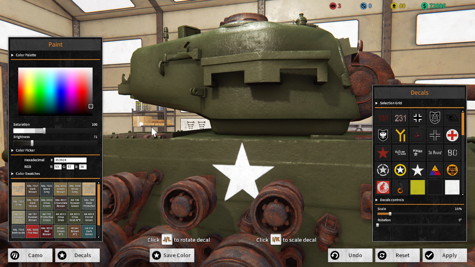 RGB and Hex Color Input fields - Player will be able to input a custom value to either a RGB or Hex type input field, and the tank color will be selected based on that input. The input fields and color picker will be set initially, when the tank is placed into paint room to the color, that the tank currently has.