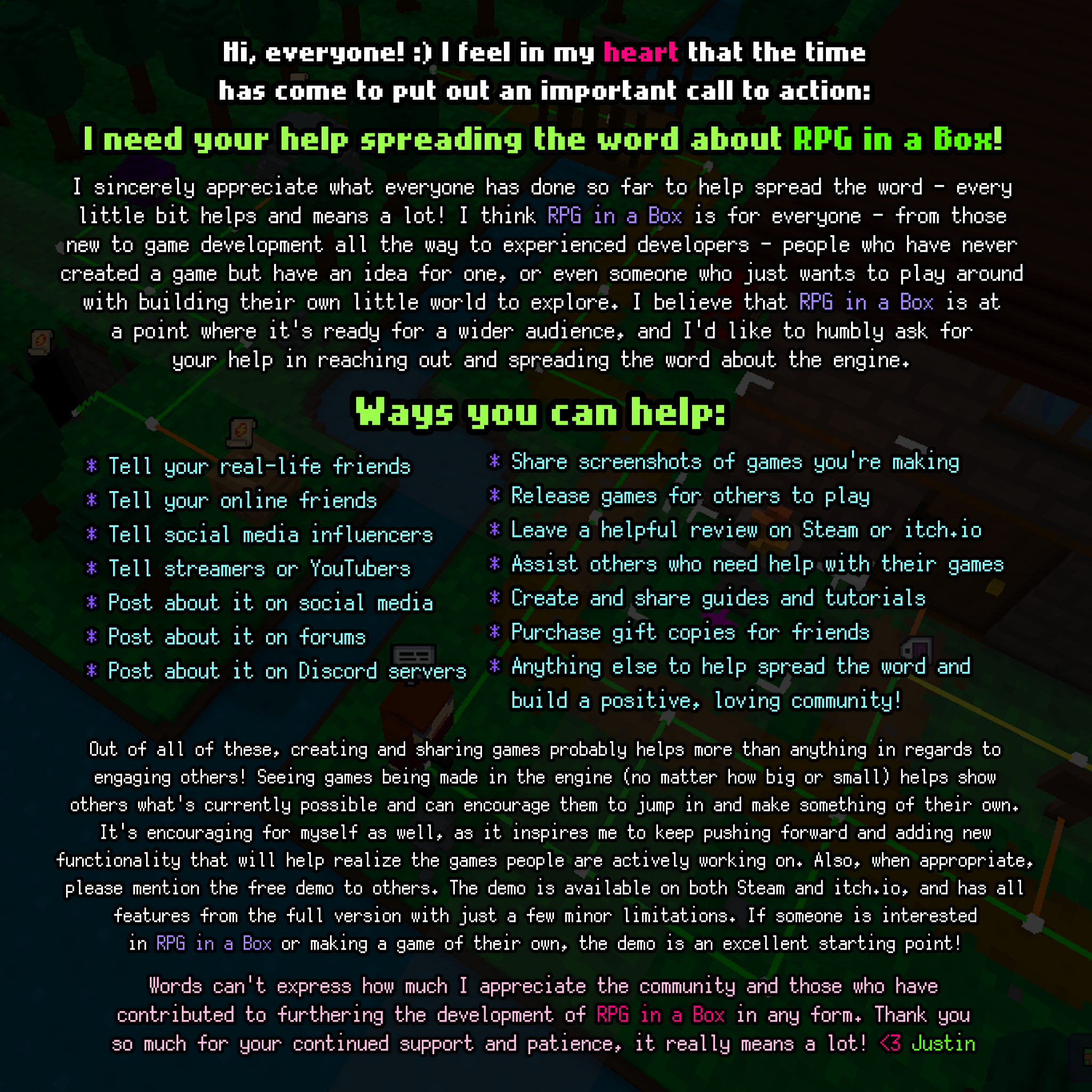 Hi everyone! Thanks to my wonderful wife, there is now an official RPG in a Box subreddit! This is a place where you can share anything and everything RPG in a Box related, where people can post about and promote their own projects. Hopefully given the format of Reddit it will provide a better platform for sharing things so they don't get lost in the shuffle quite as easily as they can other places. So please come and join and post lots of screenshots and tutorials and videos and content - and be sure to cross-post and tell others so they can join, too!