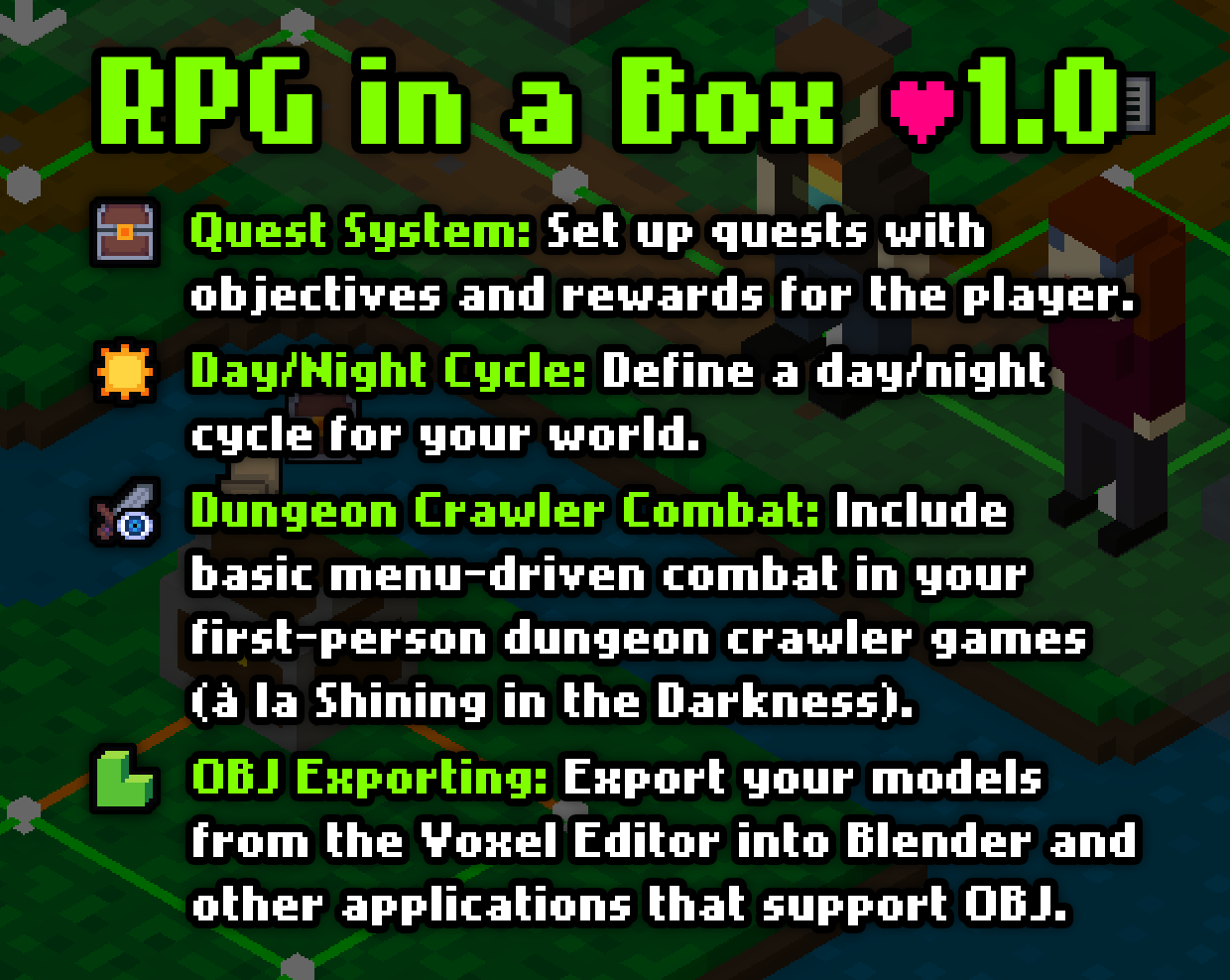 Hey everyone, I put together an overview of the major updates coming to RPG in a Box at or before the 1.0 release! The 1.0 release is currently planned for May 10th. Thank you so much for your support! 💕❤️😊❤️💕