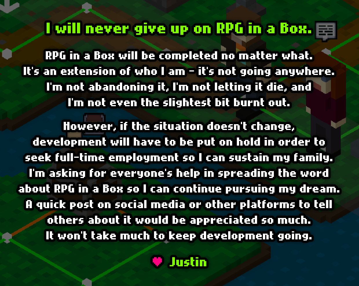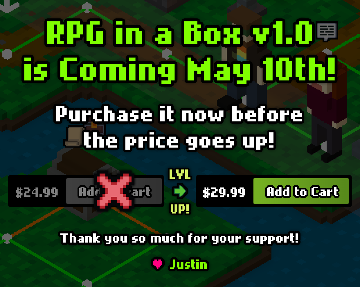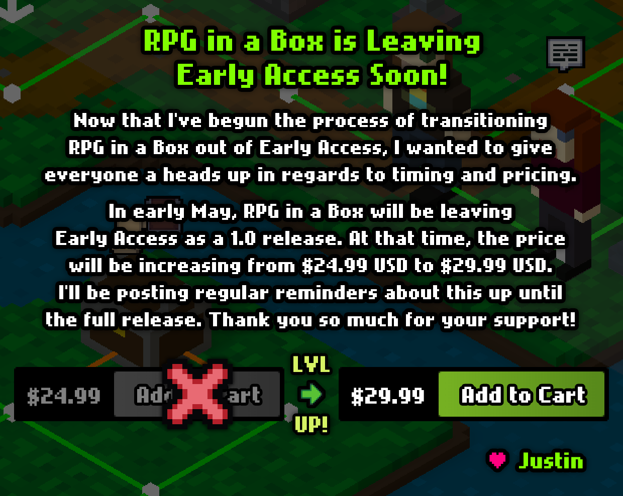 Hey, everyone! I hope you've all had an awesome week. Now that I’ve begun the process of transitioning RPG in a Box out of Early Access, I wanted to give everyone a heads up in regards to timing and pricing. In early May, RPG in a Box will be leaving Early Access as a 1.0 release. At that time, the price will be increasing from $24.99 USD to $29.99 USD. I’ll be posting regular reminders about this up until the full release. Thank you so much for your support! ❤️🥰