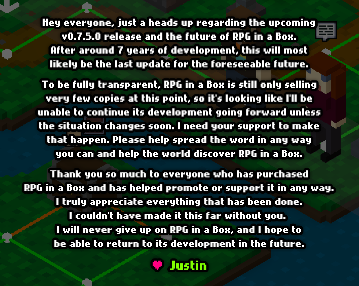 Hi everyone! After much thought, consideration of recent feedback, and a serious examination of its current state, I've decided that it's time to finally start transitioning RPG in a Box out of Early Access. Upon leaving Early Access and becoming v1.0, the price of RPG in a Box will be increasing slightly to account for the many new features that have been added since its initial release. This does not change anything in regards to the future development plans of RPG in a Box. I still have many, many things in store for it after moving out of Early Access, as my full vision is far from complete! Keep an eye out over the coming days for more details on the timing of everything and what to expect. Thank you so much, I greatly appreciate everyone's support during this time! ❤️