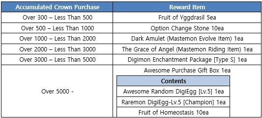 ※ All items from the event are character bound. ※ Items are awarded in a cumulative manner according to the amount of Crown purchased. ※ However, if you have received the reward items from the Promotion Event above, items purchased during the event cannot be refunded. ※ Reward items will be provided on 07.20.