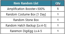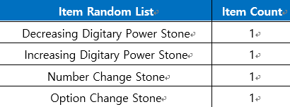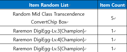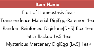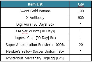- Golden Egg Laying Goose Pouch [Price: [1ea] ▶ 198 C] [Random List] - X-Antibody Factor : Alphamon Ouryuken(Awaken)-Beta 1ea - Cross Data – Time (ZeedMillenniumon’s Evolution Slot Item) 1ea - Sealed Digital Hazard Ring 1ea - Boltboutamon : Data Code - Piedmon 1ea - Rare Jogress Random DigiEgg [Lv.5] 1ea - Raremon DigiEgg-Lv.5[Champion] 1ea - Hatch Backup [Lv.5] 5ea - Option Change Stone 40ea - Number Change Stone 40ea - Special Chicken Combo 200ea - Mid Class DATA Box 100ea [Bonus] Fortune Cookie 3ea