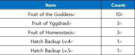※ All items except [Fruit of Yggdrasil], [Growth Fruit] will be deleted after the event period is over. ※ All items from the event are character bound and cannot be traded.