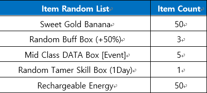 - Target : Tamers who have not logged in since 2021.04.15 - How : 1. When the Tamer who is applicable logs in, the item [2021 Returning Tamer Support Bundle] 1ea is sent to the Tamer’s Cash Warehouse