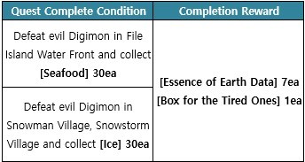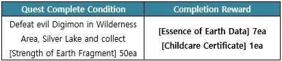 10. Upon completion of the quest [With Agumon's Power, Jump!], as well as the quest [To the Digital World!] from Richard Sampson after progressing through the main quests in Yokohama Village, the sub quest [To Silver Lake] can be received from NPC Agumon at Silver Lake 11. Upon completion of the sub quest [To Silver Lake] by talking to Agumon, reward is provided