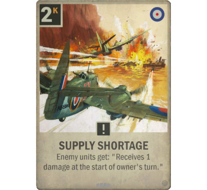 The first time you win a Skirmish you will receive a full set of the new unique card, Supply Shortage. This standard card costs 2 Kredits to play and deals 1 damage to enemy units at the start of the owner’s turn. This new card will also be craftable with wildcards even after this event ends.