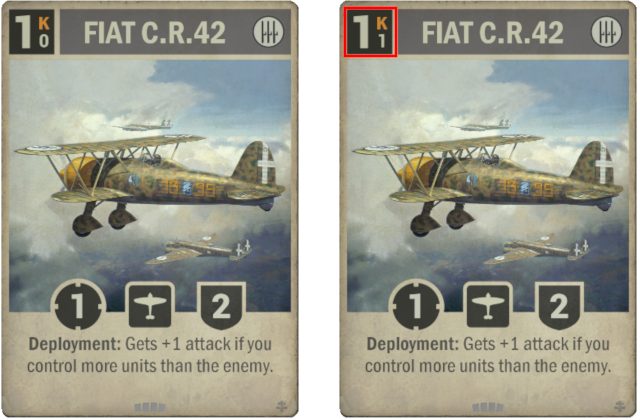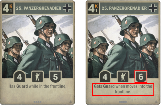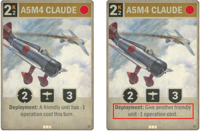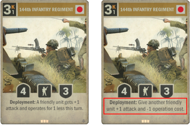 Old: Deployment: A friendly unit gets +1 attack and operates for 1 less this turn. New: Deployment: Give another friendly unit +1 attack and -1 operation cost.