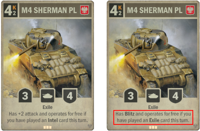 Old: Has +2 attack and operates for free if you have played an Intel card this turn. New: Has Blitz and operates for free if you have played an Exile card this turn.