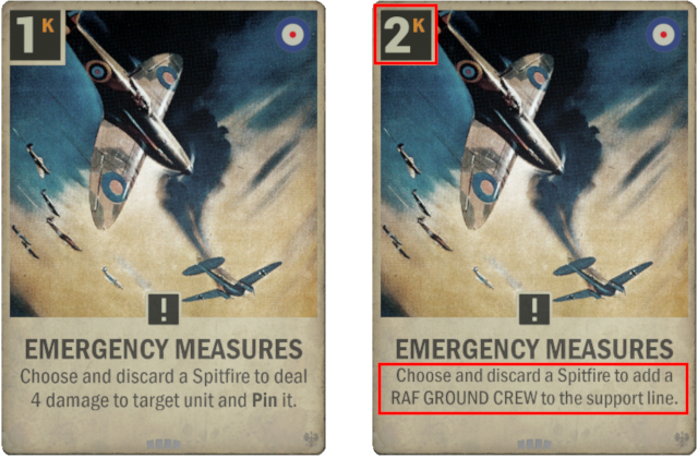 Old: Choose and discard a Spitfire to deal 4 damage to target unit and pin it. New: Choose and discard a Spitfire to add a RAF GROUND CREW to the support line.