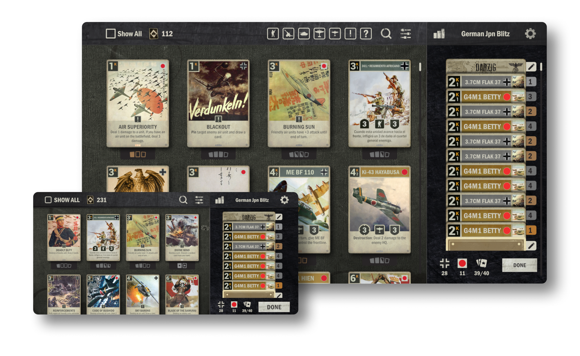 2. Collection - Filtered by the nations in the deck. Scroll or swipe up/down to view all the cards. Click/tap on any card for details, history and the ability to create cards with wildcards.